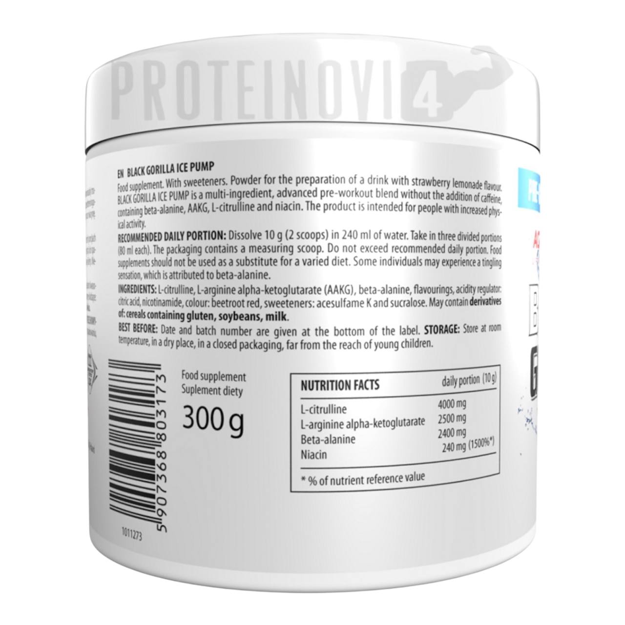 Black Gorilla Ice Pump – це високоякісна суміш перед тренуванням, що не містить кофеїн. Одна порція продукту містить 4000 мг. L-цитрулін, який додає енергії під час тренування. Більше того, цей інгредієнт також сприяє підвищенню ефекту пампу та дозволяє створити так званий м’язовий насос. У склад продукту також входить AAKG (аргінін альфа-кетоглутарат), який впливає на подовження викликаючого ефекту, тим самим покращуючи кровообіг, що може сприяти більш інтенсивному тренуванню. Крім того, що містяться в цьому продукті ніацин та бета-аланін допомагають зменшити відчуття болю.