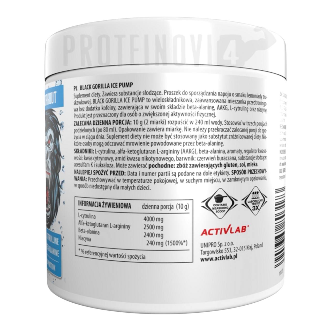 ActivLab Black Gorilla Ice pump 300gr – це багатокомпонентна попередньотренувальна суміш без додавання кофеїну, що містить бета-аланін, AAKG, L-цитрулін та ніацин. Продукт призначений для людей із підвищеними фізичними навантаженнями.