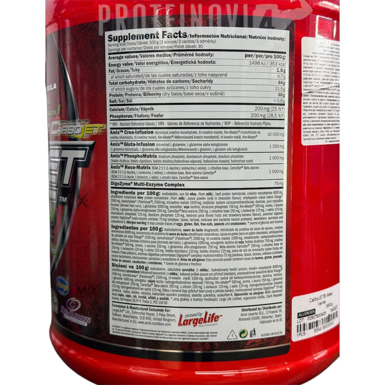 Amix CarboJet Gain Mass Professional 1.8kg – це спеціально розроблений вуглеводно-білковий гейнер, збагачений високоякісними амінокислотами в свободній формі (BCAA та L-глютамін), L-цитруліном, бета-аланіном і величезною дозою креатинового комплексу.
