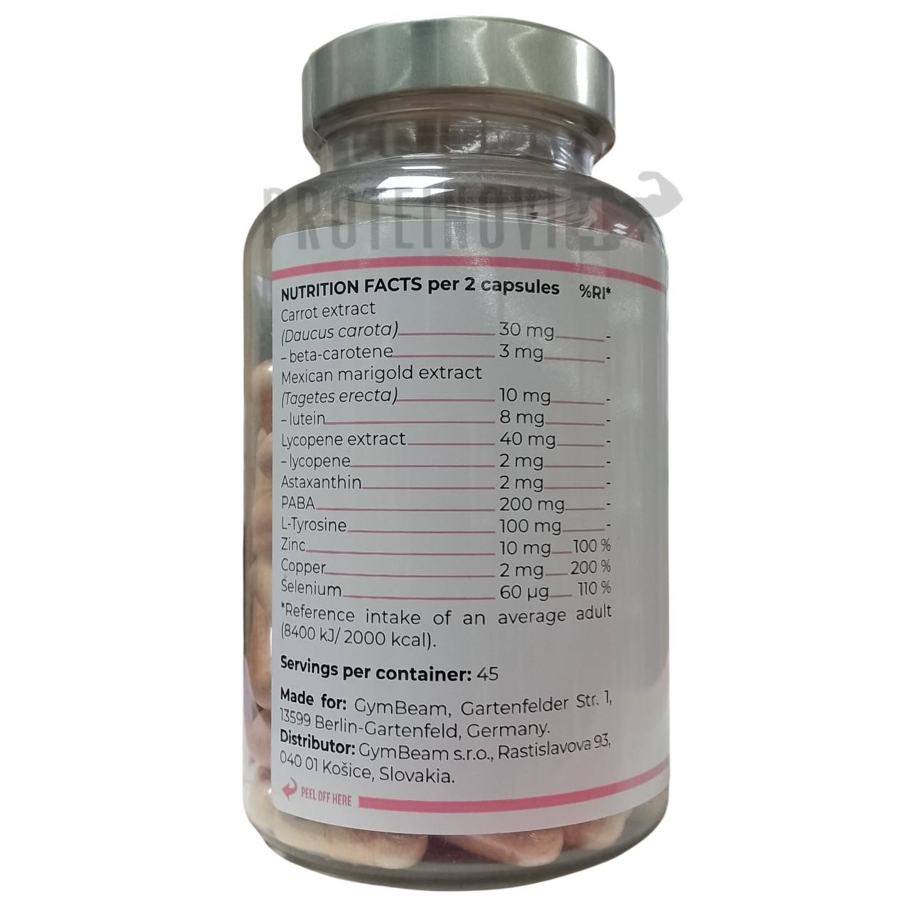 Склад: Наповнювач (мікрокристалічна целюлоза), пара-амінобензойна кислота (PABA), L-тирозин, екстракт лікопіну (5% лікопіну), засіб проти злипання (стеарат магнію), бісгліцинат цинку, екстракт моркви (Daucus carota) (10% бета-каротин), L-селенометіонін, екстракт африканських чорнобривців (Tagetes erecta) (80% лютеїну), бісгліцинат міді, астаксантин (з водоростей), желатинові капсули (желатин, Allura red AC-FD & C red 40 *, діоксид титану).