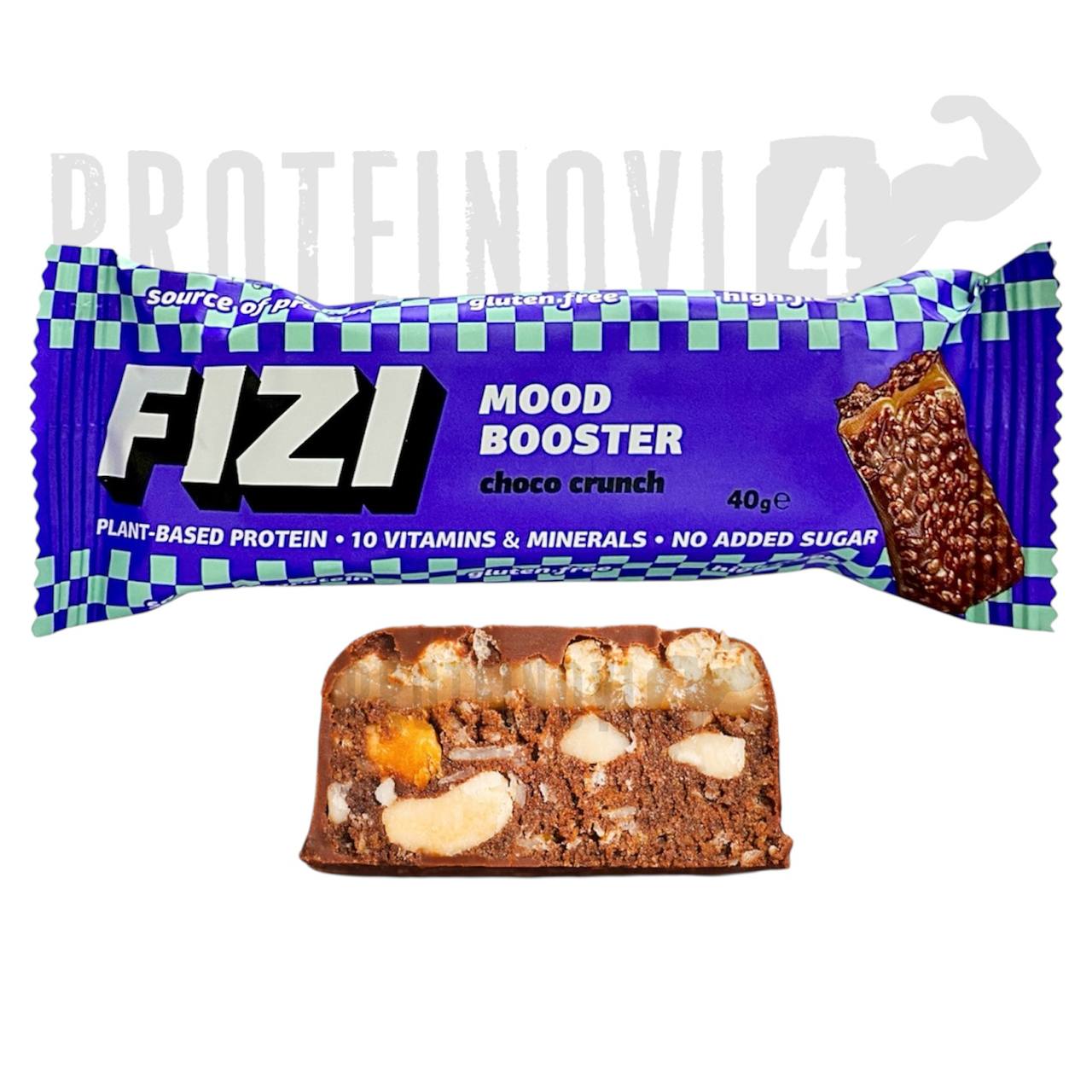 Fizi Mood Booster Choco Crunch 40g – смачний протеїновий батончик з шоколадом та карамеллю. Багате джерело рослинного білка та клітковини. Містить 10 вітамінів та мінералів. Не має в складі доданого цукру. Надає енергію. Ідеальний варіант для швидкого та корисного перекусу.
