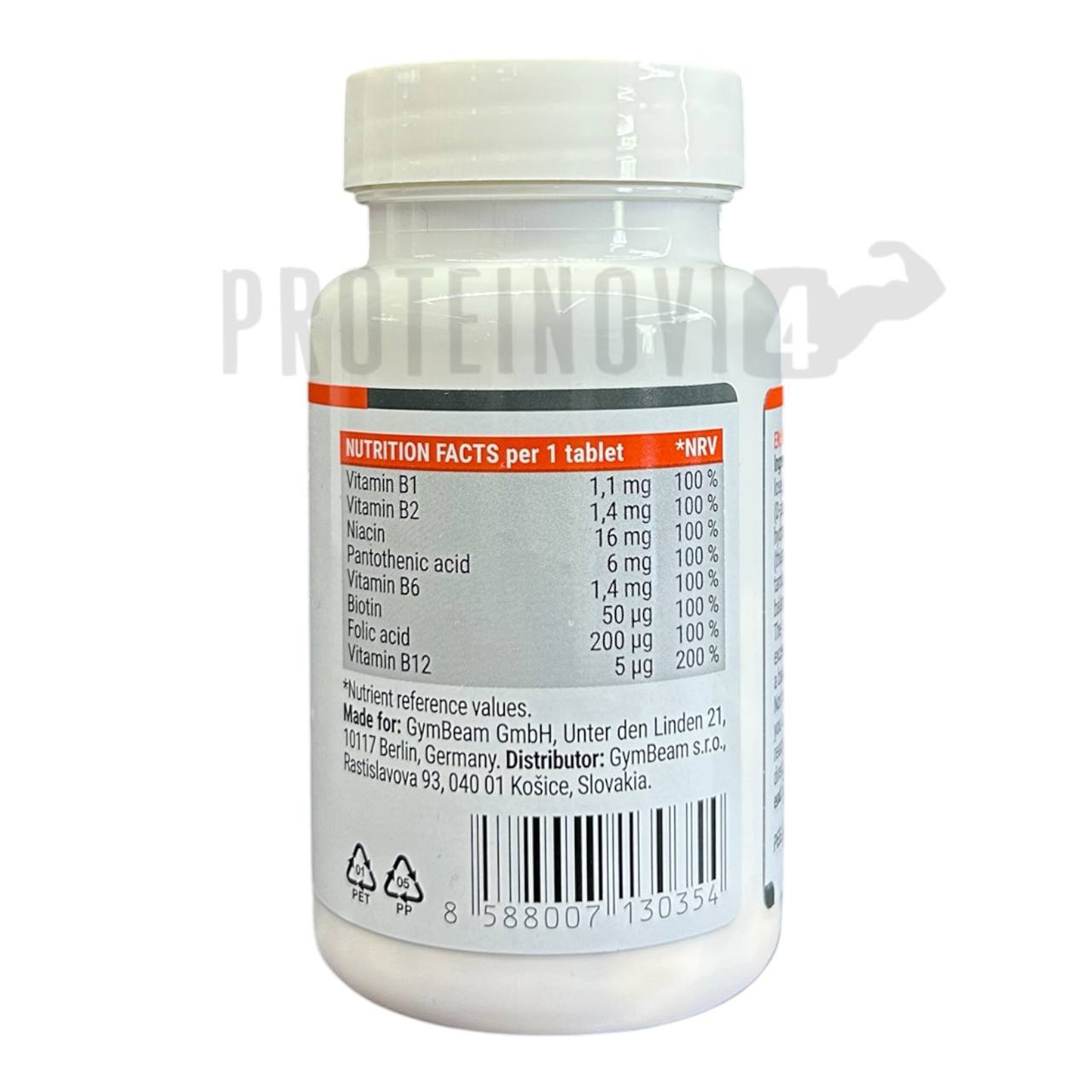 Інгредієнти: Наповнювач (сорбітол), вітамін В3 (нікотинамід), вітамін В5 (кальція D-пантотенат), вітамін В6 (піриодиноїгідрохлорид), вітамін B1 (мононітрат тіаміну), вітамін B2 (рибофлавін), вітамін B1 (тіаміну гідрохлорид), вітамін B9 (птероілмоноглутамінова кислота), вітамін B7 (D-біотин), вітамін B12 (цианокобаламін), вітамін B12 (метилкобаламін), засіб проти злипання (стеарат магнію).