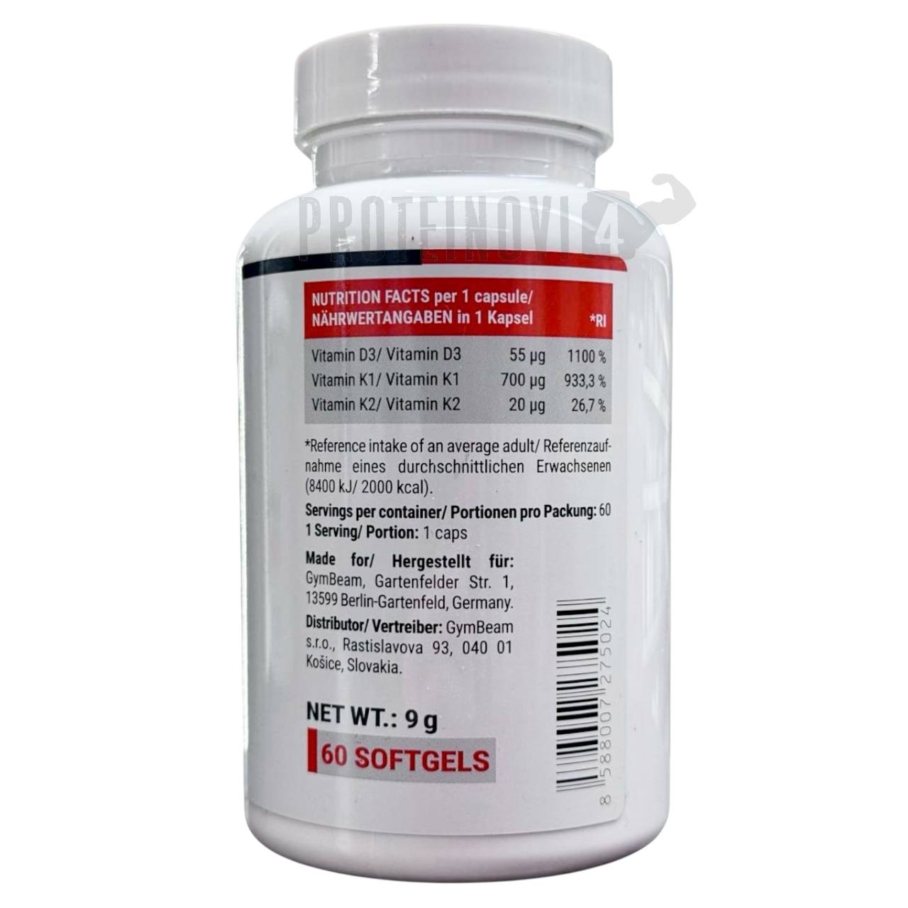 GymBeam Vitamin D3+K1+K2 60Softgels — це ефективна комбінація вітамінів D і K, які добре поєднуються між собою. Ці три вітаміни посідають незамінне місце в організмі та беруть участь у різних біологічних процесах. Наприклад, вітамін D підтримує нормальну роботу імунної системи та сприяє підтримці нормального рівня кальцію в крові. Вітамін K, у свою чергу, сприяє нормальному згортанню крові.