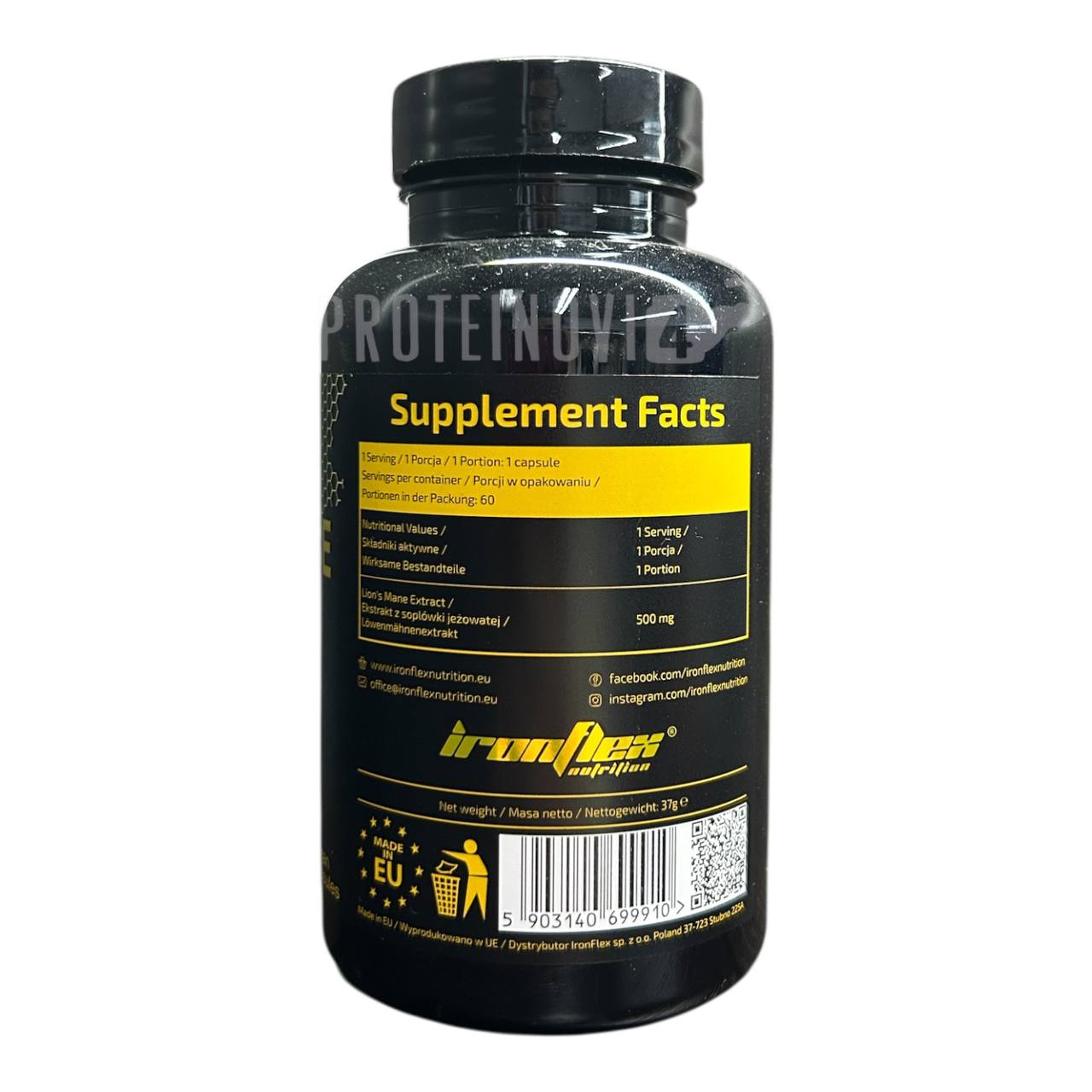 IronFlex Lions Mane mushroom 60caps – це харчова добавка, що містить гриб львиная грива (ежовик гребенчатий), який має протизапальні та нейропротекторні властивості. Цей нейропротекторний препарат стимулює когнітивні функції, покращує пам’ять і настрій, знімає стрес і тривогу, а також сприяє підвищенню ефективності навчання.