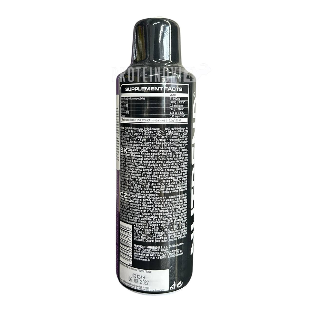 Nutrend Collagen liquid 500ml –це рідка колагенова добавка, створена для комплексної підтримки суглобів, зв’язок, шкіри, волосся та нігтів. Завдяки рідкій формі продукт швидко засвоюється і забезпечує організм необхідними компонентами для відновлення та підтримки тканин.