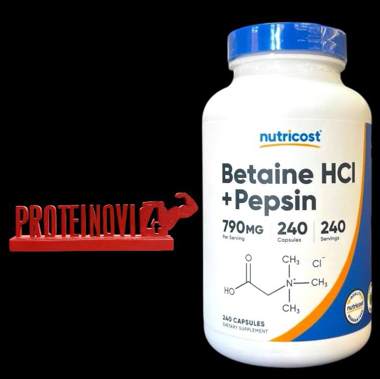 Бетaїн гідрoхлoрид і пeпсин Nutricost Betaine HCL + Pepsin 240Caps — це засіб для покращення травлення, який використовується для лікування розладів травлення, печії та дефіциту поживних речовин, спричинених недостатньою кислотністю шлунка. Ризик зменшення кількості шлункового соку (гіпoхлоргідрії) збільшується через вік, стрес, куріння або тривале застосування антaцидів.