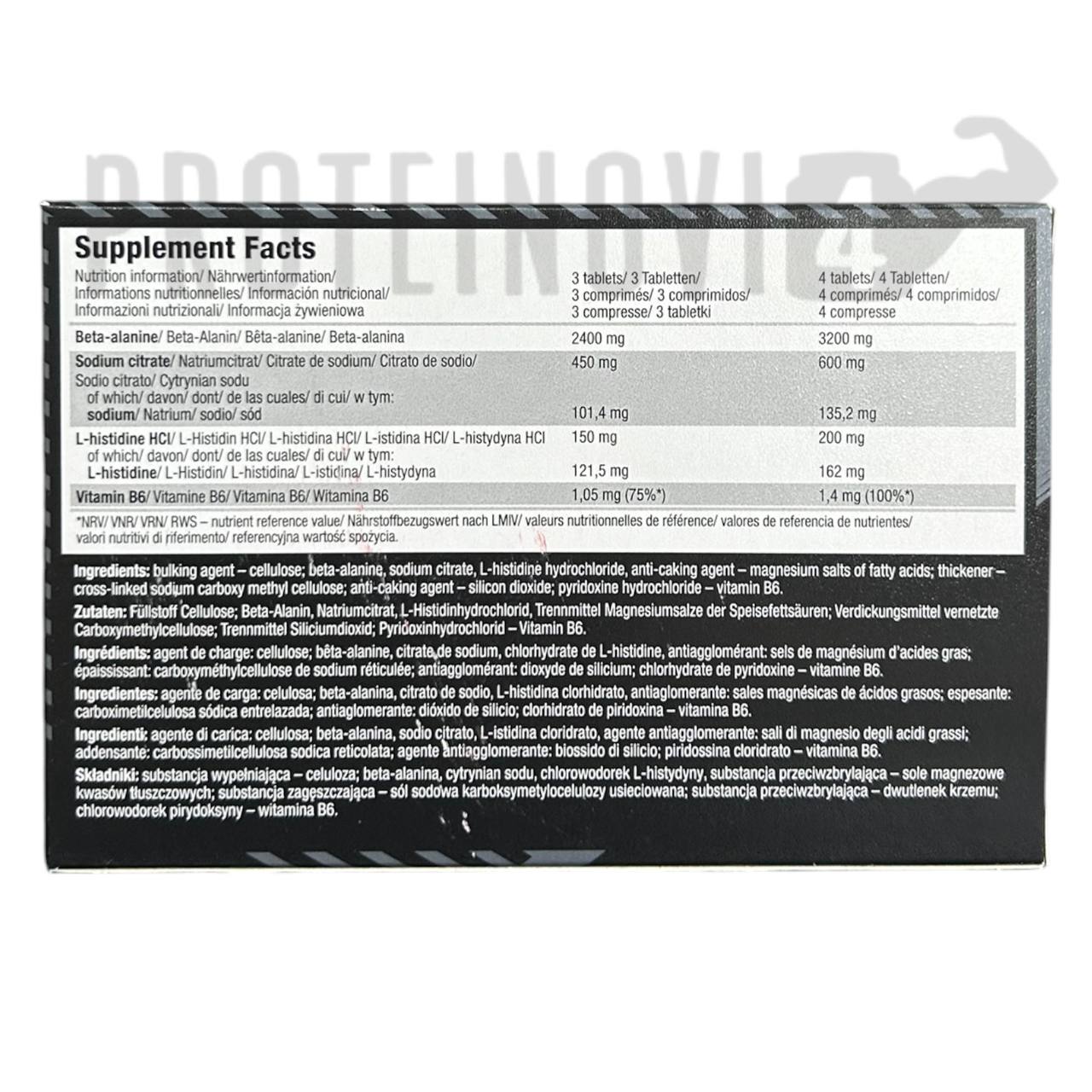 Основний компонент — бета-аланін, який сприяє підвищенню рівня карнозину в м’язах. Це допомагає зменшити накопичення молочної кислоти, відтермінувати м’язову втому та дозволяє тренуватися довше й інтенсивніше. У 1 порції (4 таблетки) міститься 3200 мг бета-аланіну.