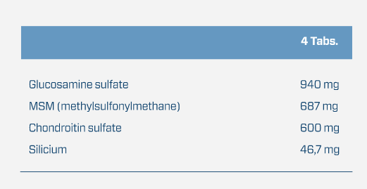 Сульфат глюкозаміну, метилсульфонілметан, сульфат хондроитина, мальтодекстрин, диексекстрин, діокседитрин, діоксцексин, сушений стебель бамбука (Bambusa arundinacea L.) (70% кремнію) і антиагломерат (стеарат магнія). Містить сліди ракооподібних. Може містити сліди молока, сої, клейковини, риби та яєць.