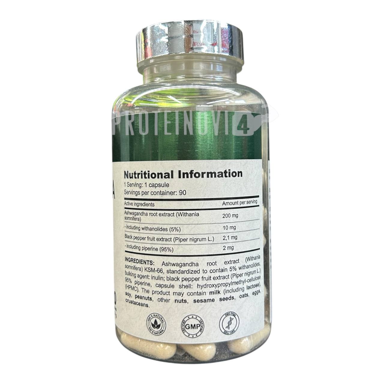 Інгредієнти: екстракт кореня ашваганди (Withania somnifera) KSM-66, стандартизований до 5% витанолидів, наповнювач: інулін; Екстракт плодів чорного перця (Piper nigrum L.) 95% піперина, оболочка капсули: гідроксипропілметилцелюлоза